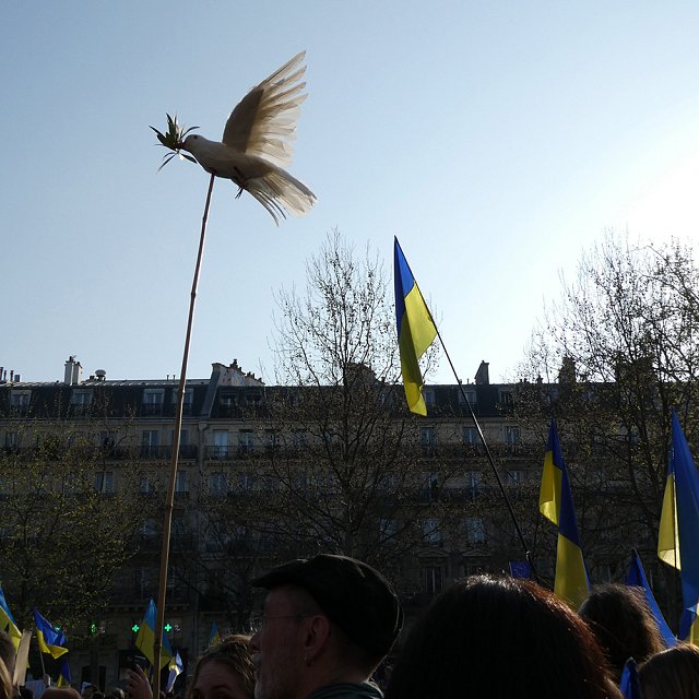 The Dove is also shown at Artist Banners at St.-Gengoux-le-National, Burgundy, Summer 2022, open air exhibition on the initiative of Anne and Max Lanci.