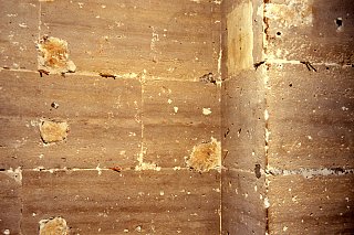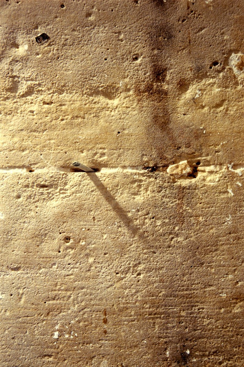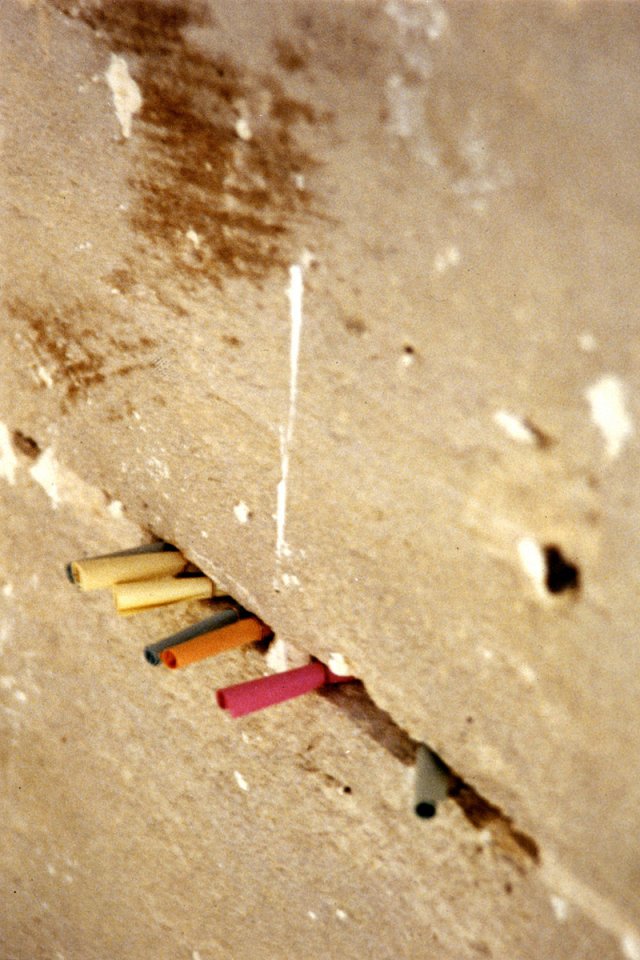Small rolled pieces of paper were stuck into the cracks in the walls of the exhibition space ; reminding one of the Wall of Lamentations.
