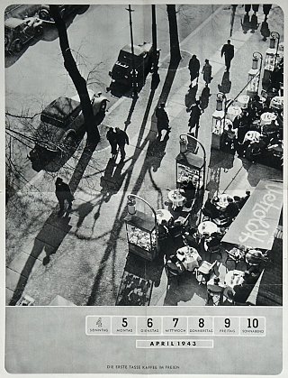 Le premier café en terrasseFeuille de calendrier mural, avril 1943, trouvée dans les archives familiales. En pleine guerre, l’image et sa légende suggèrent une vie normale. Comme si tout allait bien. -