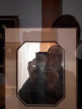 Saisir HumboldtSelfie dans la partie réfléchissante d’un daguerréotype, le portrait d’Alexander von Humboldt par Hermann Biow, 1847, dans l’exposition Licht und Leinwand, Staatliche Kunsthalle Karlsruhe, 2019 -