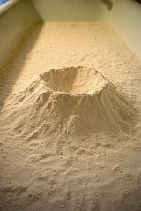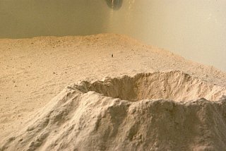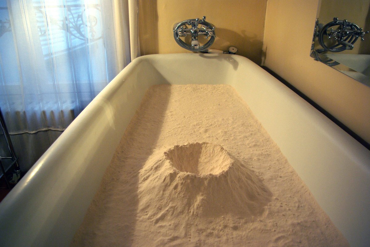Installation produced for the 10th anniversary of ANMA, an architectural practice, at the Cour Valmy, Paris ; non-hardened plaster powder, 1/200 model figurine.
