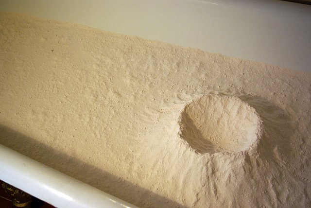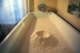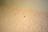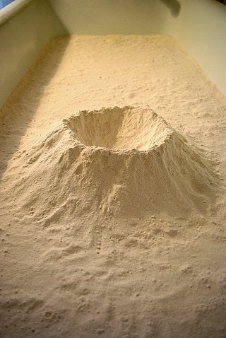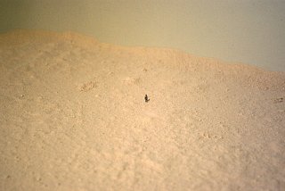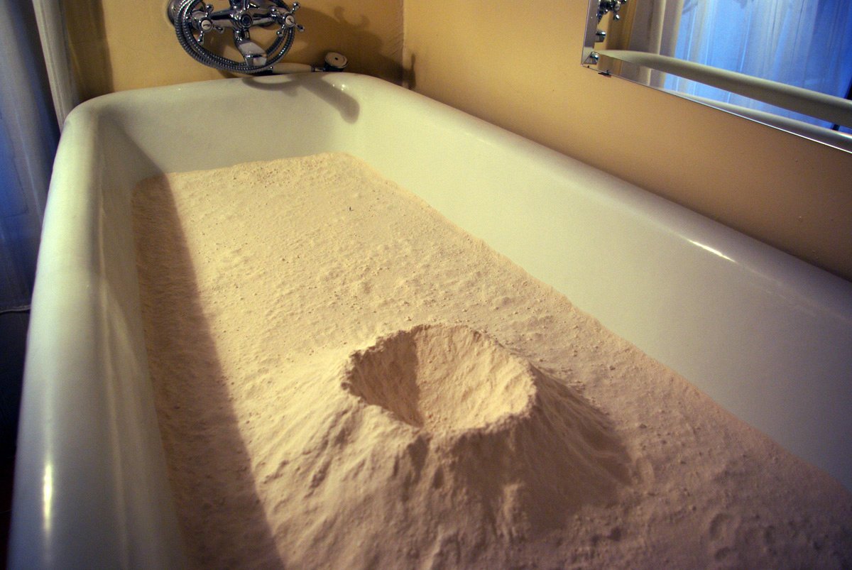 A volcano emerges from the bathtub. A solitary figure wanders about in this barren landscape.