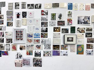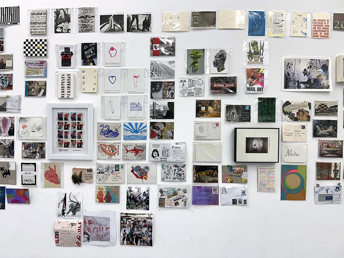 The postcard editions Entre!, Point of View, Roma 2000 and Nada among many others on the wall at Immanence