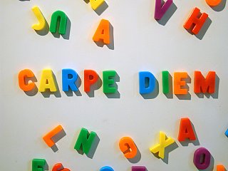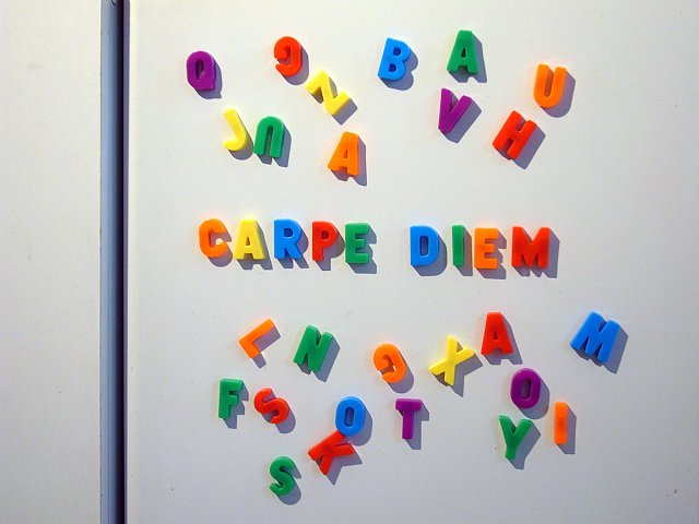 Lettres magnétiques pour enfants sur porte de frigo, reprenant la maxime latine classique « Carpe diem = Cueille le jour », une inscription que l’on trouvait souvent sur des cadrans solaires : une exhortation, d’après un poème d’Horace, à bien profiter du temps présent, dans l’idée que le futur est incertain et que tout est appelé à disparaître...