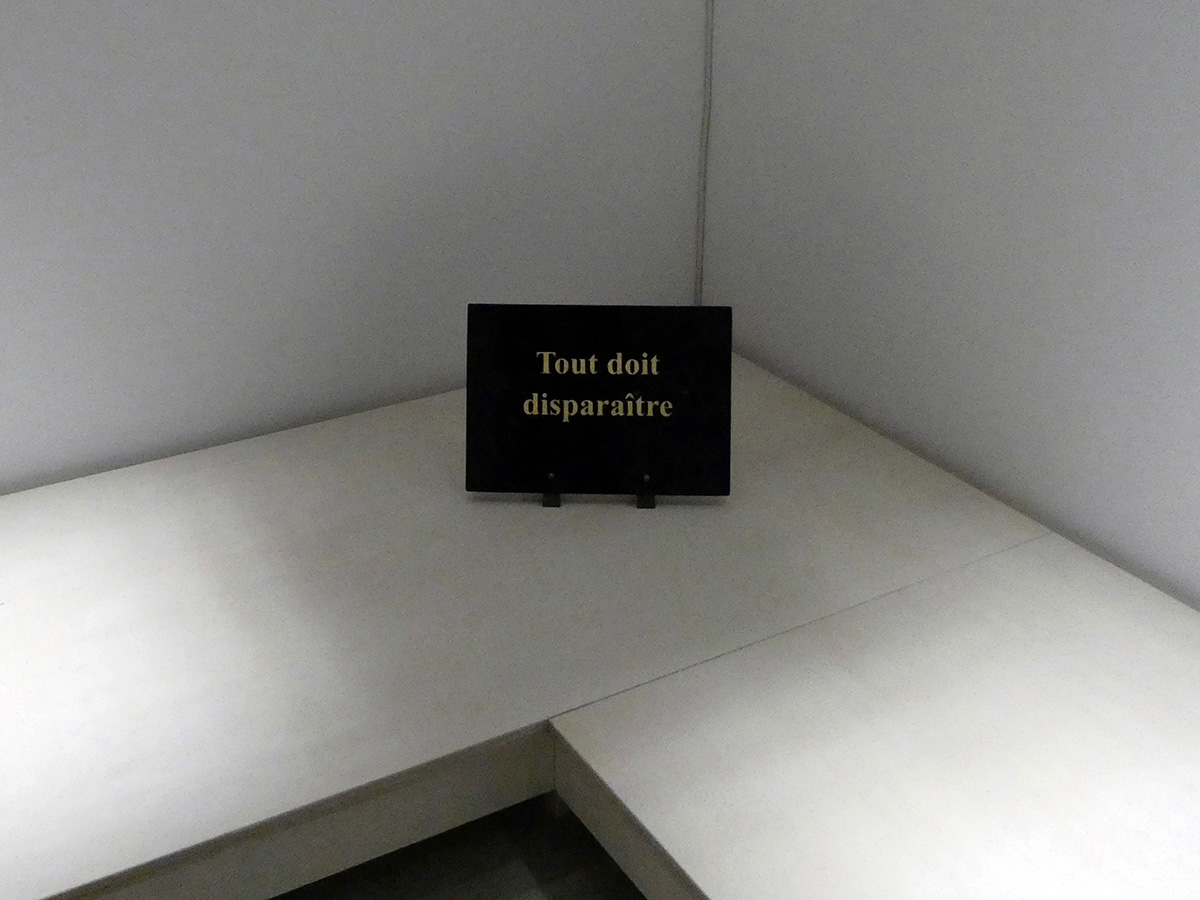 Le fameux slogan des soldes « Tout doit disparaître » devient, gravée sur du granite noir poli, un memento mori philosophique, et, au-delà de la destinée de tout un chacun, épitaphe de notre mode de vie hyper-consumériste…