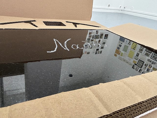 Des cartes postales et une plaque gravée en granite noir poli, conservée dans son emballage d’origine, 2025, en hommage à la célèbre gravure de Goya des Désastres de la guerre.