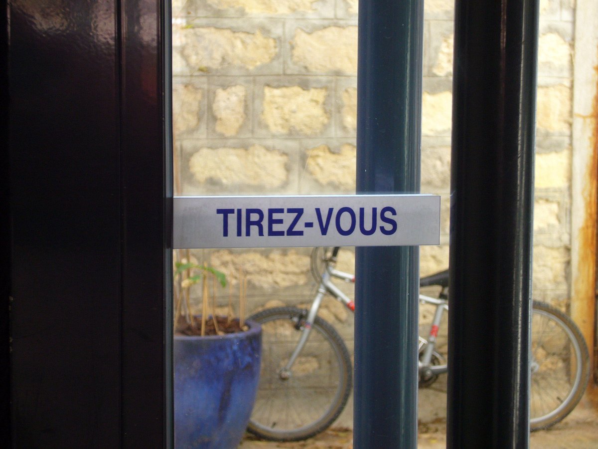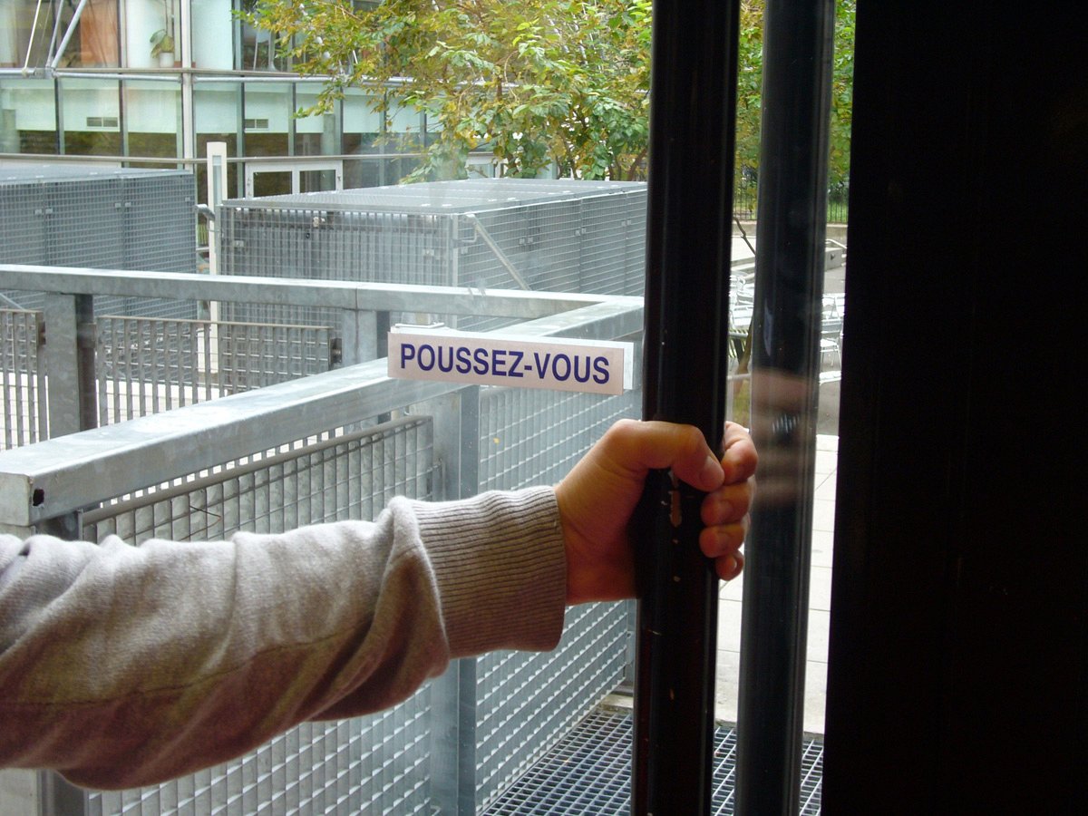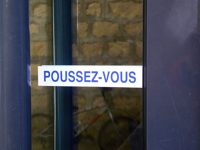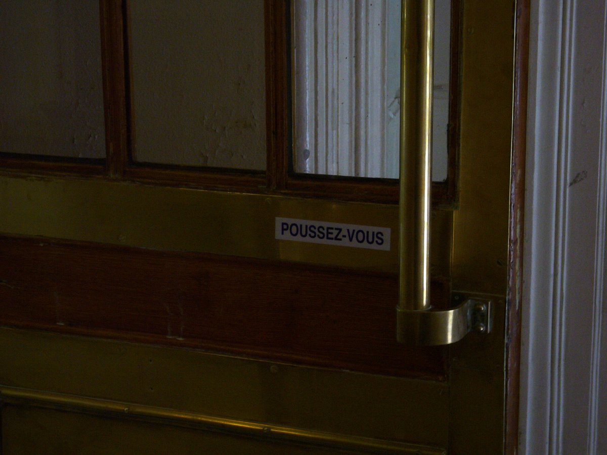 The French for “Push” and “Pull”: “Poussez” and “Tirez” become, once the word “vous” is added, almost synonymous expressions for “Out of my way!” An acid commentary about the way our life is conditioned to make us consider fellow citizens as mere obstacles to our daily trajectory.