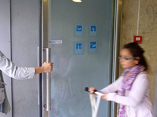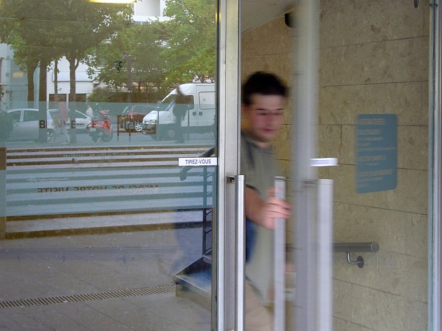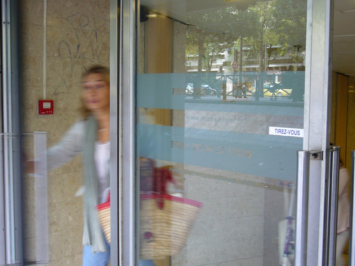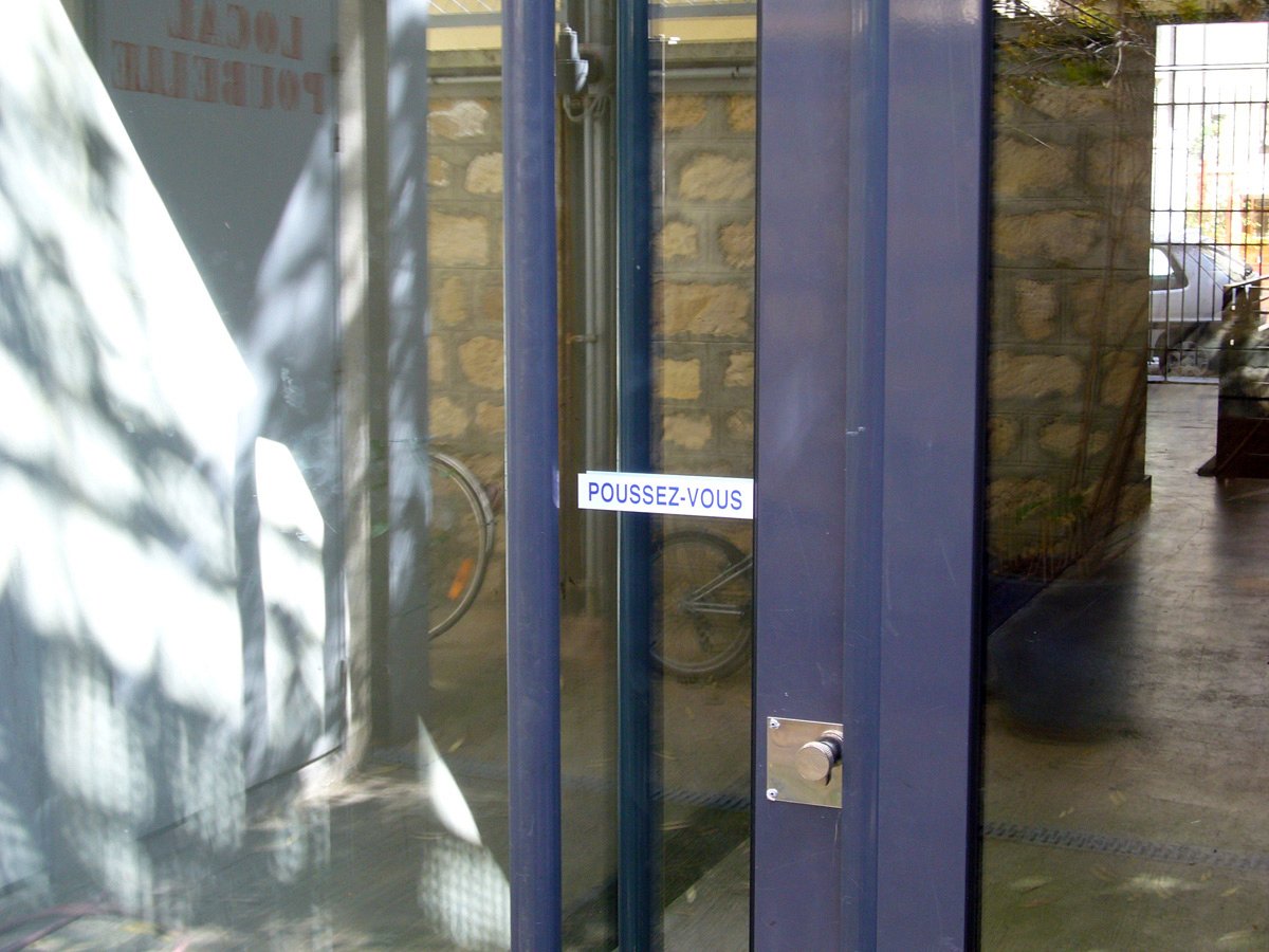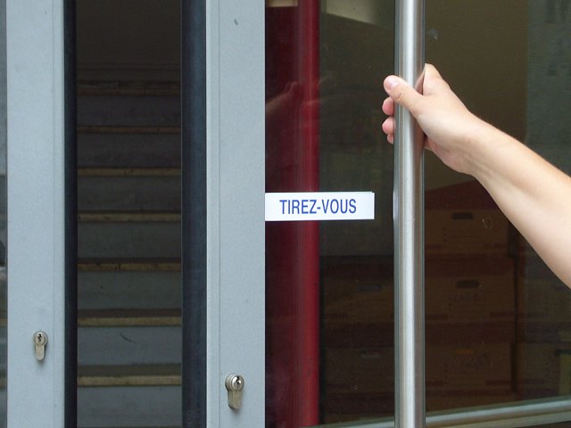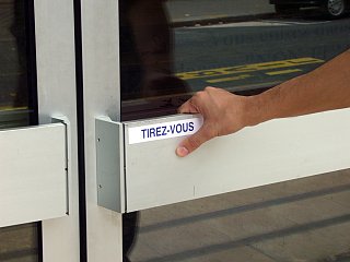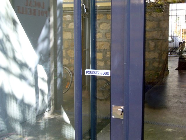 The French for “Push” and “Pull”: “Poussez” and “Tirez” become, once the word “vous” is added, almost synonymous expressions for “Out of my way!” An acid commentary about the way our life is conditioned to make us consider fellow citizens as mere obstacles to our daily trajectory.