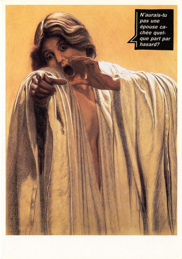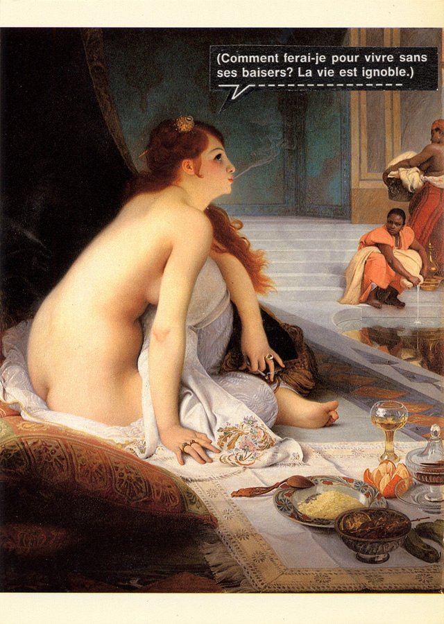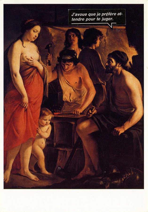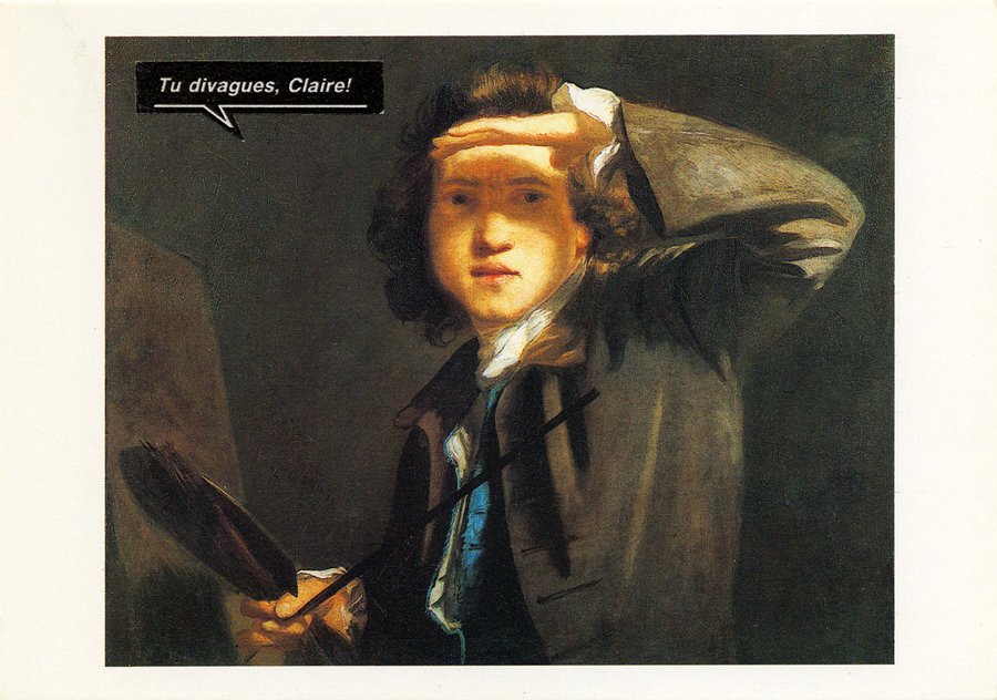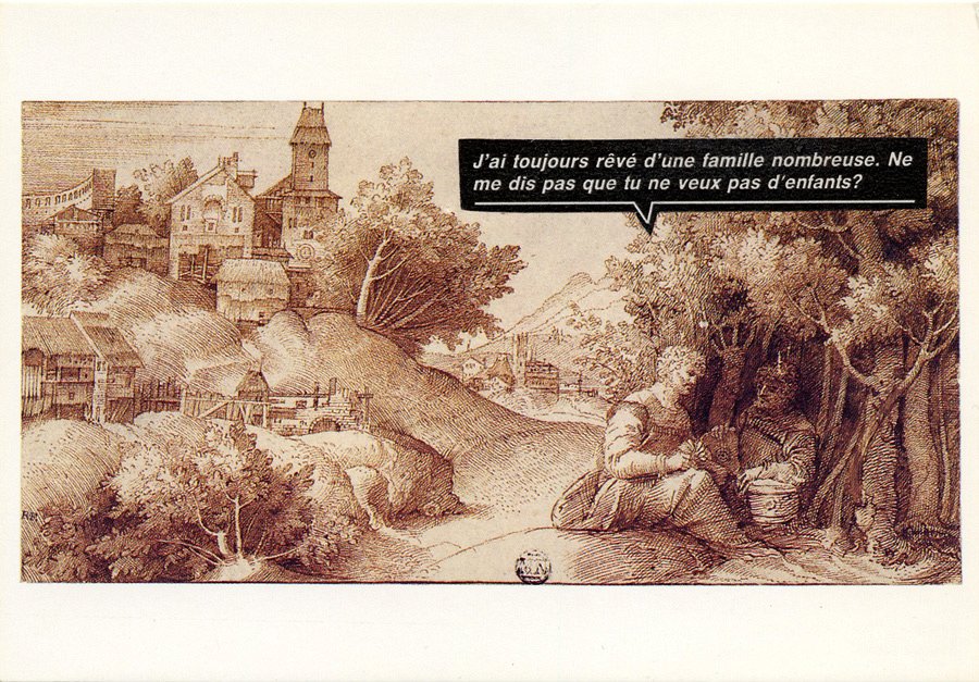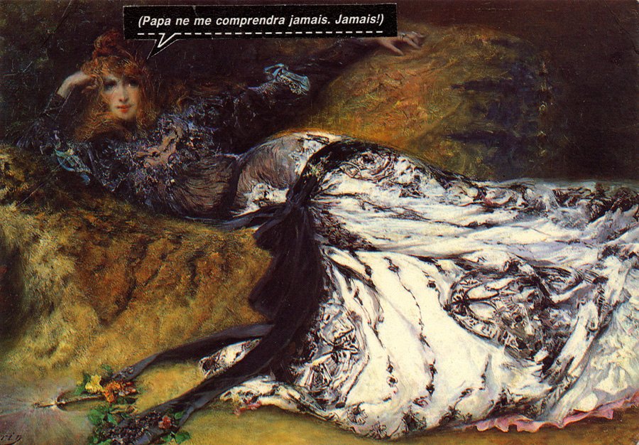Série de cartes postales d’œuvres d’arts, réinterprétées avec des bulles de dialogues découpés dans des romans-photo.