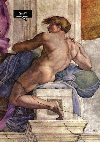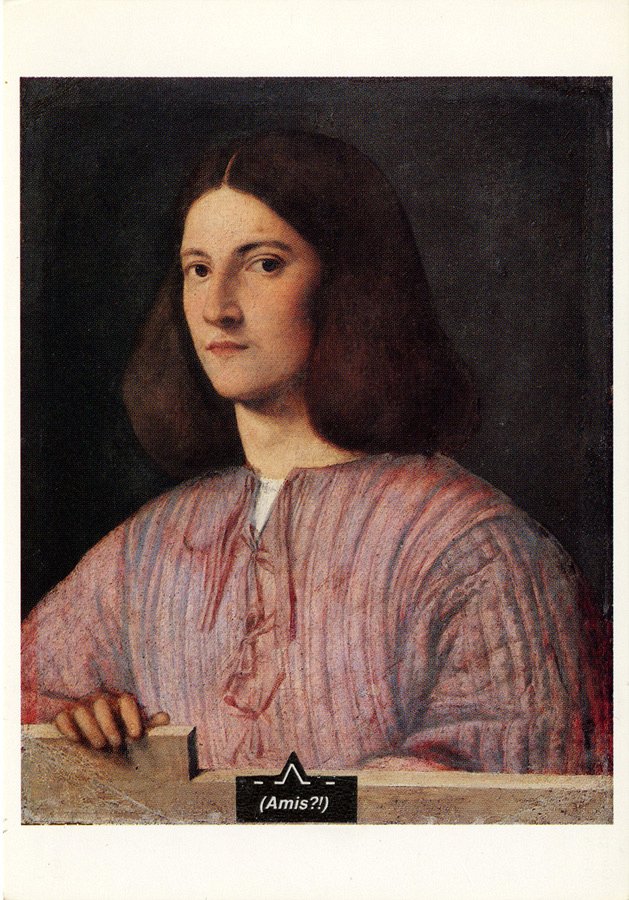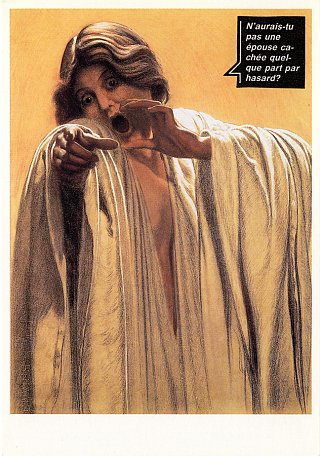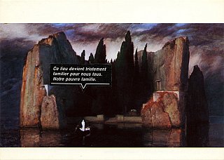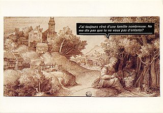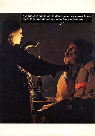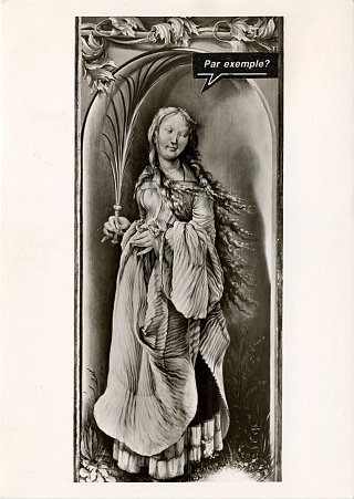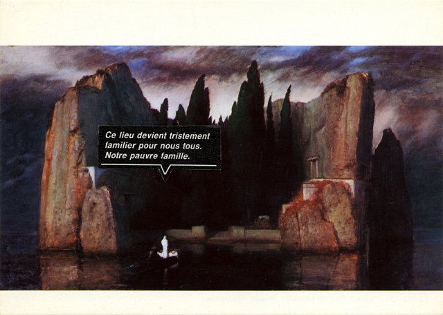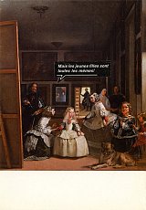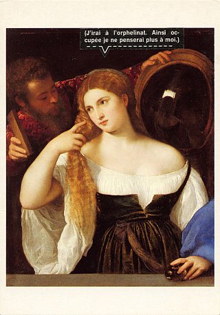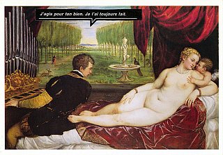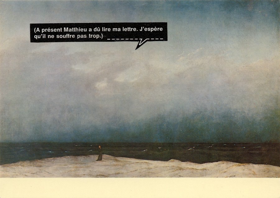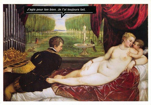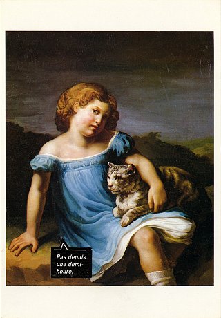 Série de cartes postales d’œuvres d’arts, réinterprétées avec des bulles de dialogues découpés dans des romans-photo.