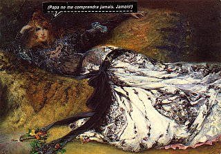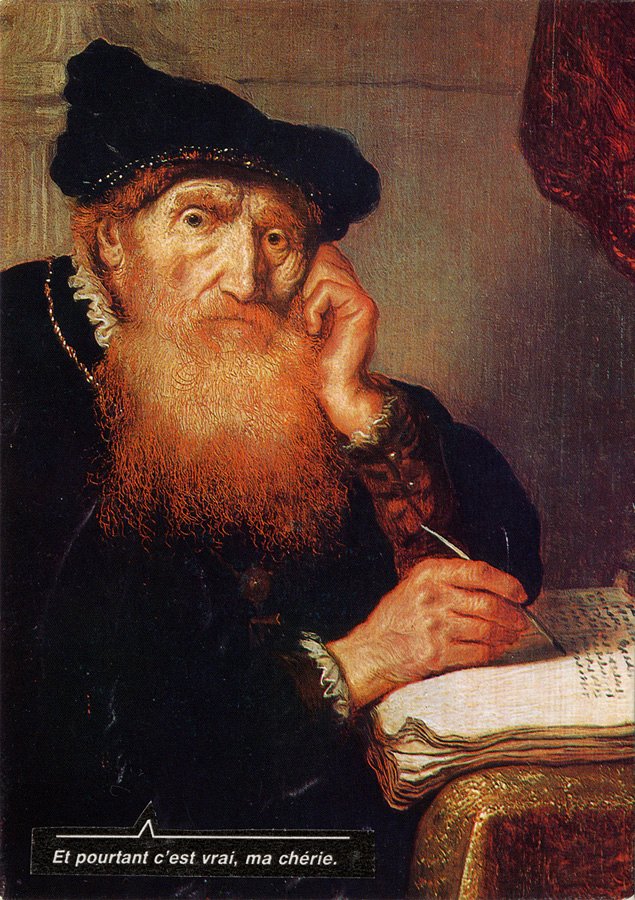 A series of art postcards, reinterpreted using speech bubbles cut out of photo-stories.
