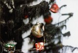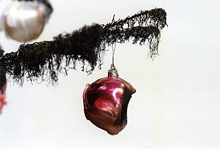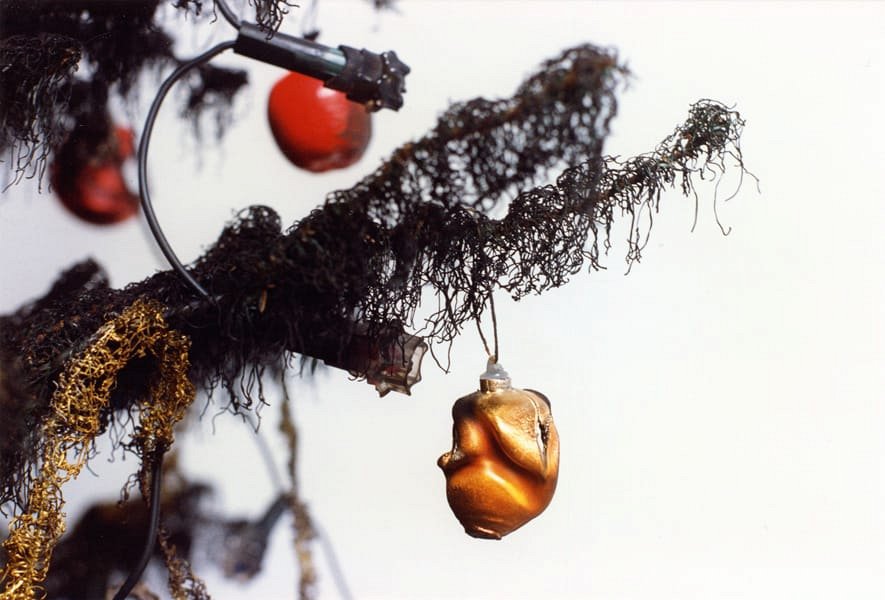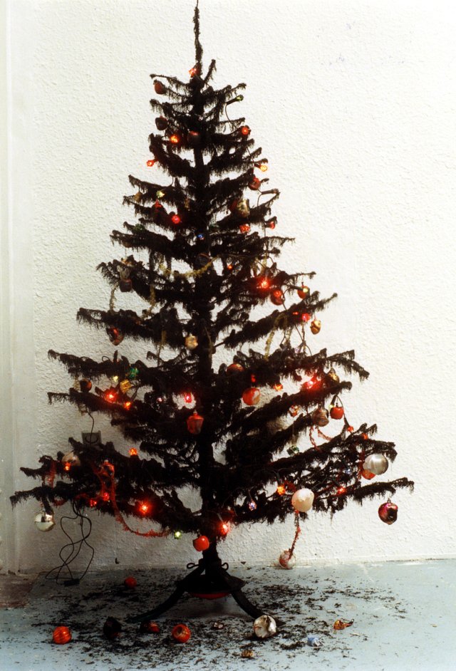 Arbre de Noël artificiel décoré, brûlé au chalumeau, les guirlandes étant restées en état de fonctionnement.Installé dans le hall d’entrée de l’immeuble de la galerie LE SOUS-SOL.