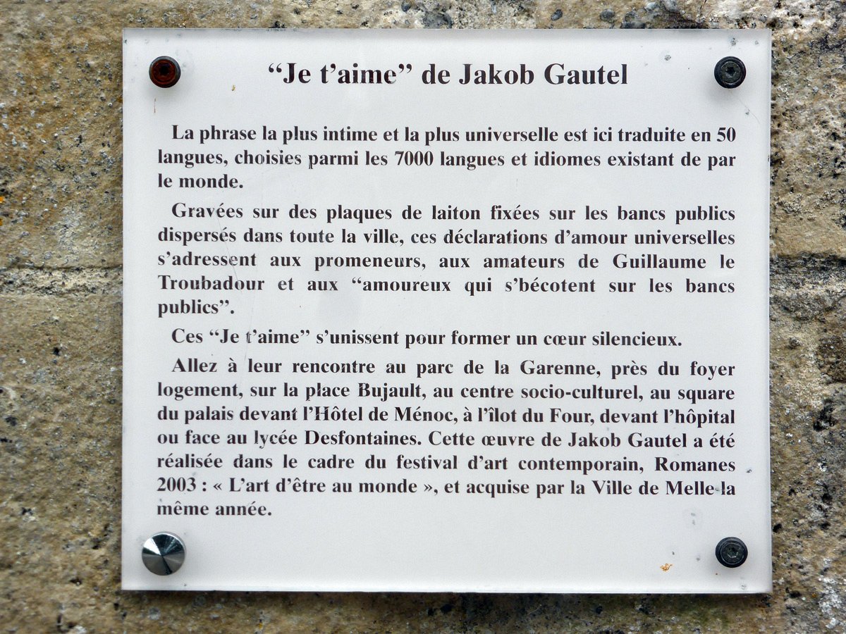 Ces plaques sont fixées sur tous les bancs des espaces publics, parcs et espaces verts de la ville de Melle. Sur le derrière des bancs est fixée une autre plaque portant le nom (et éventuellement l’origine) de la langue en question.