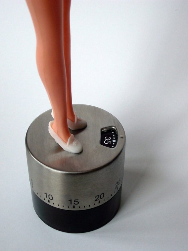 Poupée mannequin (années 1980) sur minuteur de cuisine (années 2010).