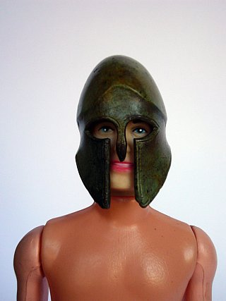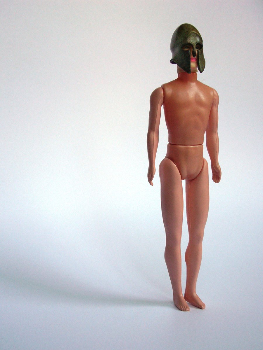 Ancienne poupée mannequin masculine (2e moitié du 20e siècle) portant la reproduction miniature d’un casque antique (Musée National Archéologique d’Athènes, début du 21e siècle). La pose rappelle celle d’un kouros.