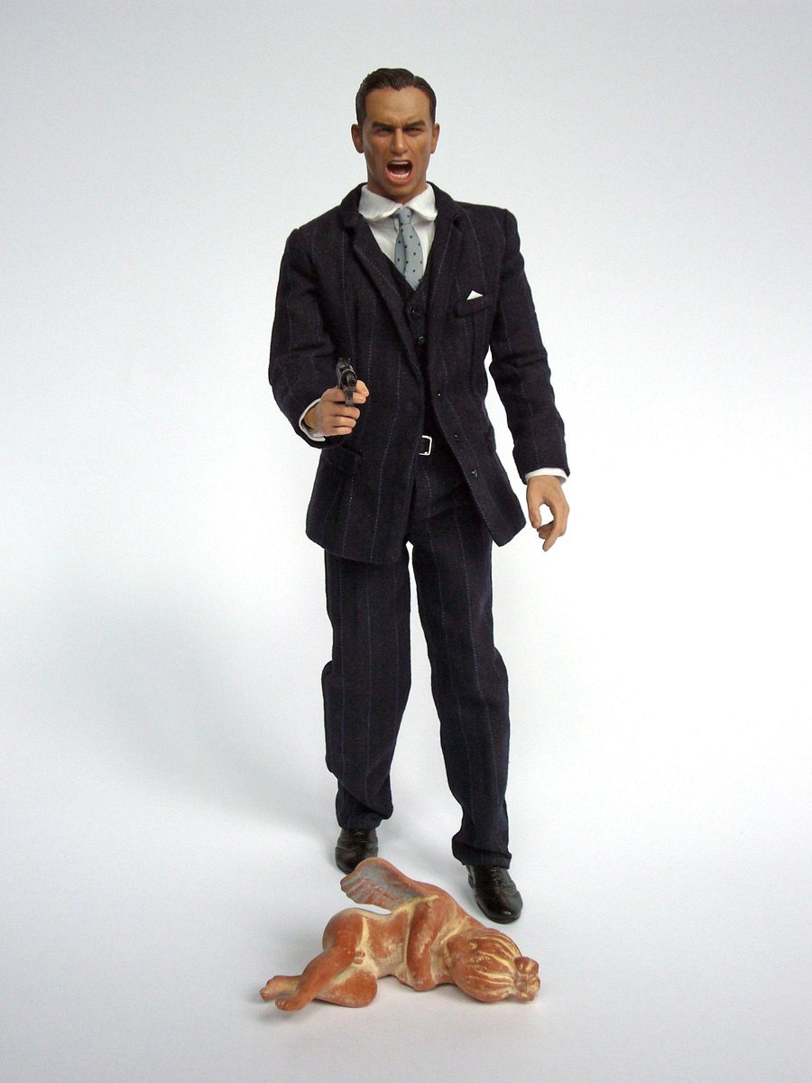 Poupée de soldat en costard cravate d’homme d’affaires, accessoires, Éros endormi (terre cuite, sculpture du dernier quart du IVe siècle avant J.-C., de Pella, nécropole orientale, probablement d’une tombe d’enfant, reproduction du Musée National Archéologique d’Athènes), début du 21e siècle.