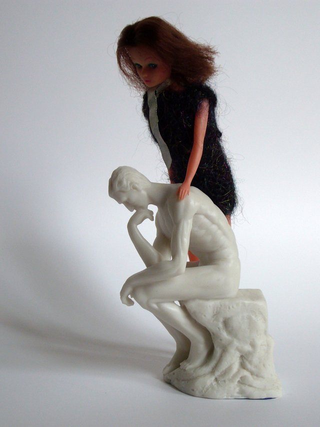 Ancienne poupée mannequin, 2e moitié du 20e siècle, et reproduction touristique du Penseur de Rodin, début du 21e siècle.