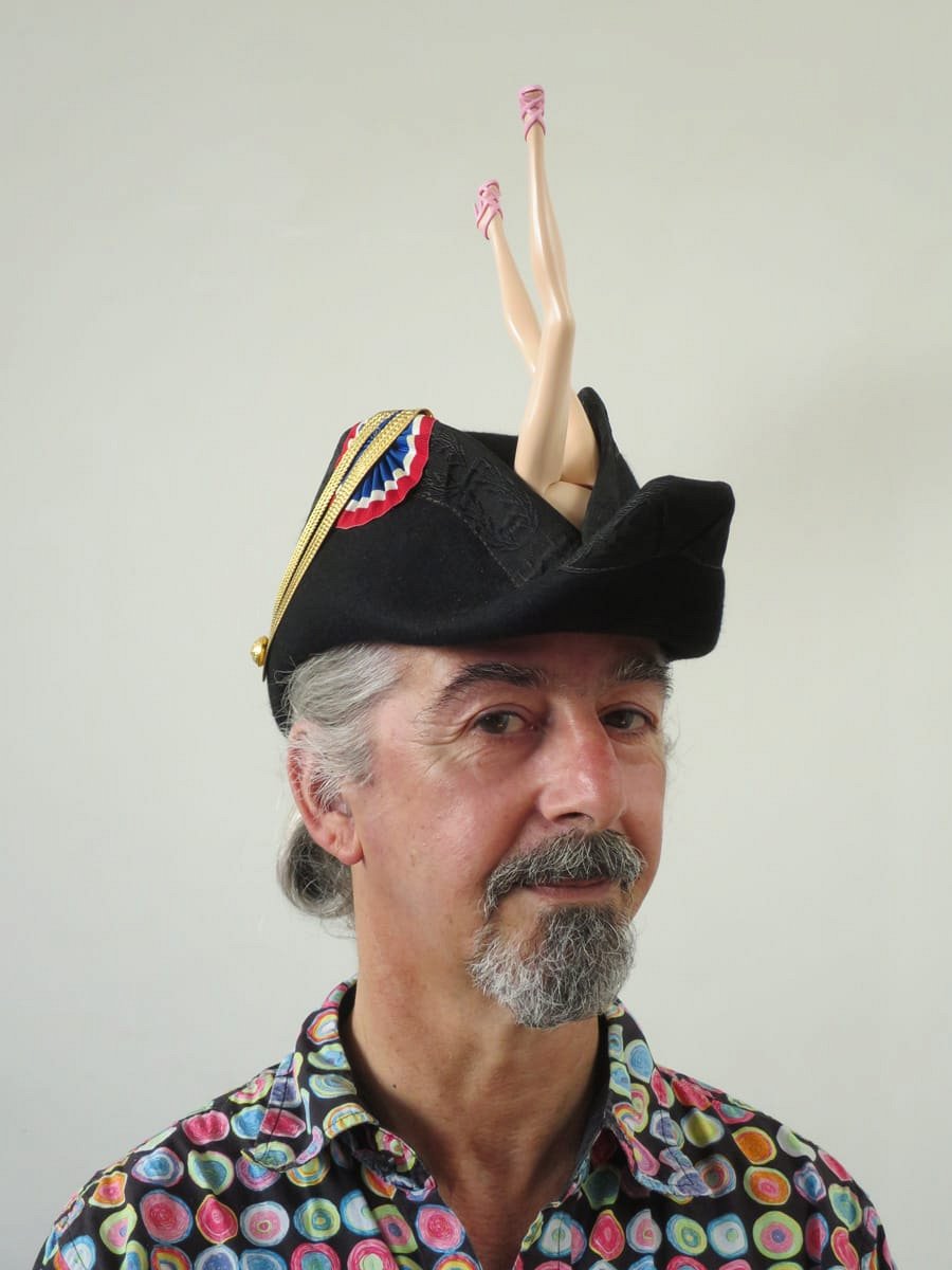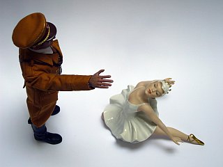 Action-Man, poupée désarticulée de jeune fille et jambes de bébé, réveil mécanique, tous de la fin du 20e siècle. La mécanique du réveil bougeait la botte vide du soldat et faisait trembler le couple dans un mouvement de danse macabre.