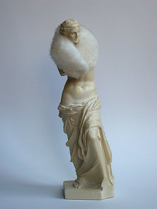 Aphrodite, dite Vénus de Milo, vers 100 av. J.-C., Île de Mélos, Cyclades, Grèce, moulage en résine à échelle réduite du musée du Louvre, habillée d’une fourrure de poupée mannequin, tous les deux du début du 21e siècle.