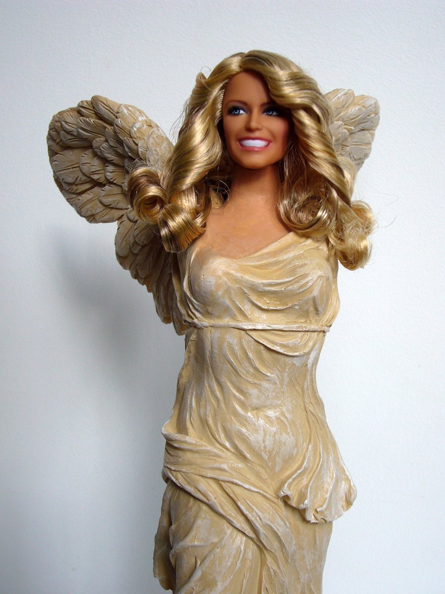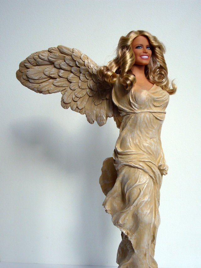 Tête de poupée à l’effigie de l’actrice américaine Farrah Fawcett, début du 21e siècle, sur reproduction touristique (de la même époque) de la Victoire de Samothrace, 2e siècle av. J.-C.