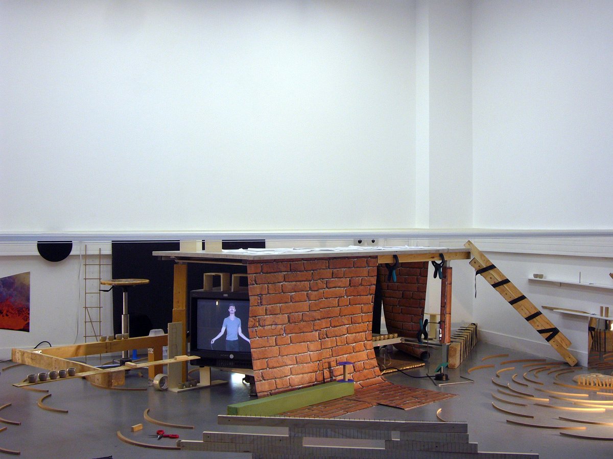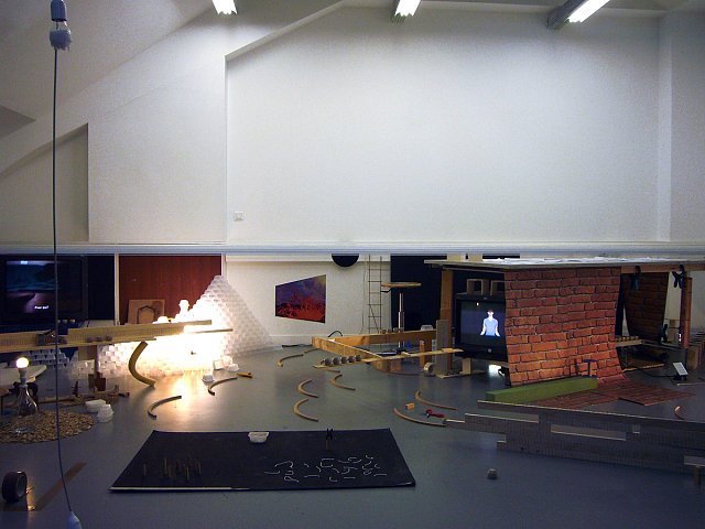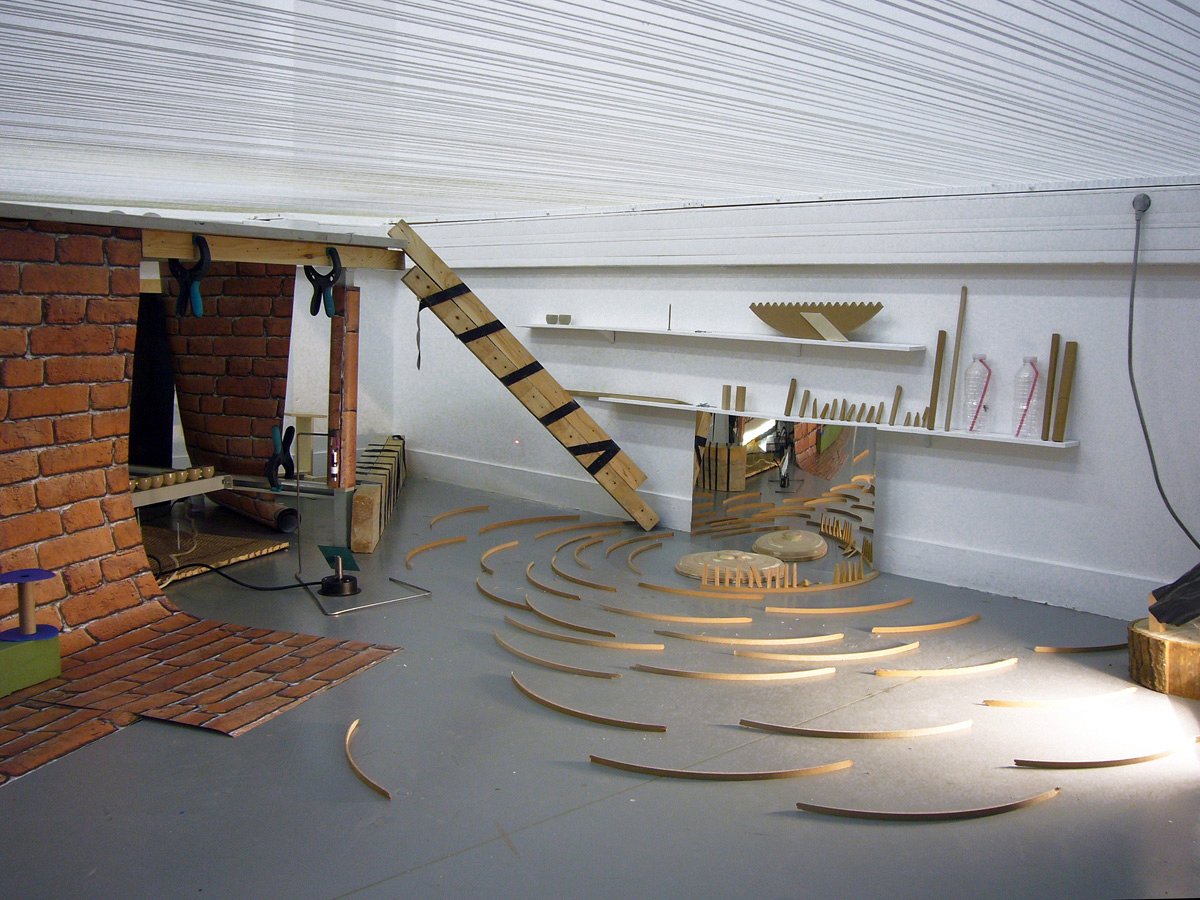 This installation - scenography for the open day in January 2014 at the Parisian art and design school ENSAD, was created during a workshop by the 4th year students of the Art and Space department Ely Bessis, Iouri Camicas, Fabien Leaustic, Julie Obadia, Ji-Min Park, Julien Rodriguez, and an invited artist, Jakob Gautel.