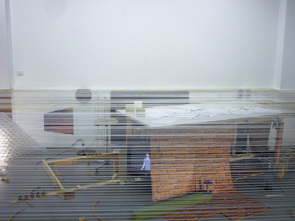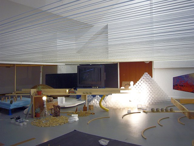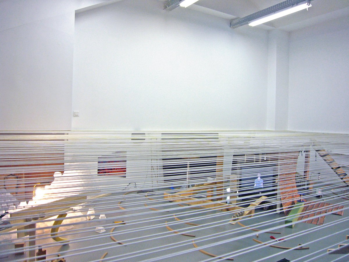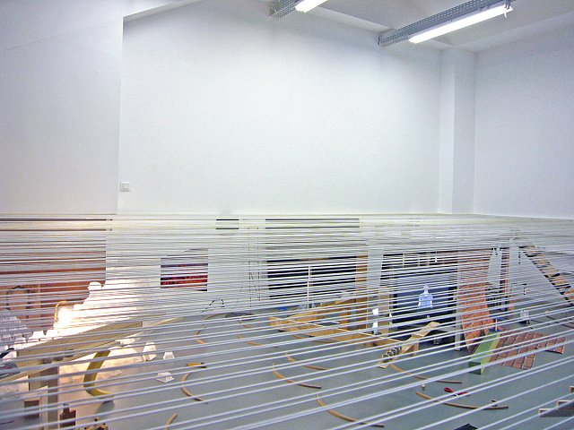 We wanted to show the dichotomy between the genesis of a work, its conception and production, and its presentation. We decided to seperate a part of the room into two by drawing a horizontal line linking the tables to a technical baseboard running at mid-height across the walls. This horizon became a suspended floor visualised by suspended threads. Underneath is the space of creational process : recent, experimental student works in progress. A living, warm atmosphere where works occupy space, mix and dialogue. Above is the official presentation space, white and immaculate - but still awaiting. Empty. A perfect space in which to project our fantasies.