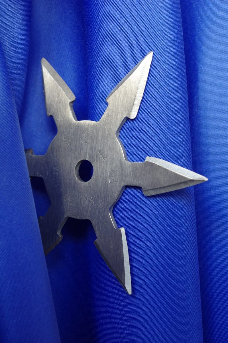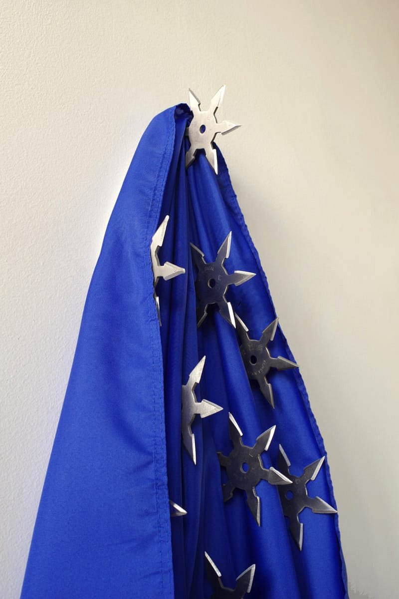12 étoiles de ninja (« shuriken ») plantées dans un drapeau bleu.