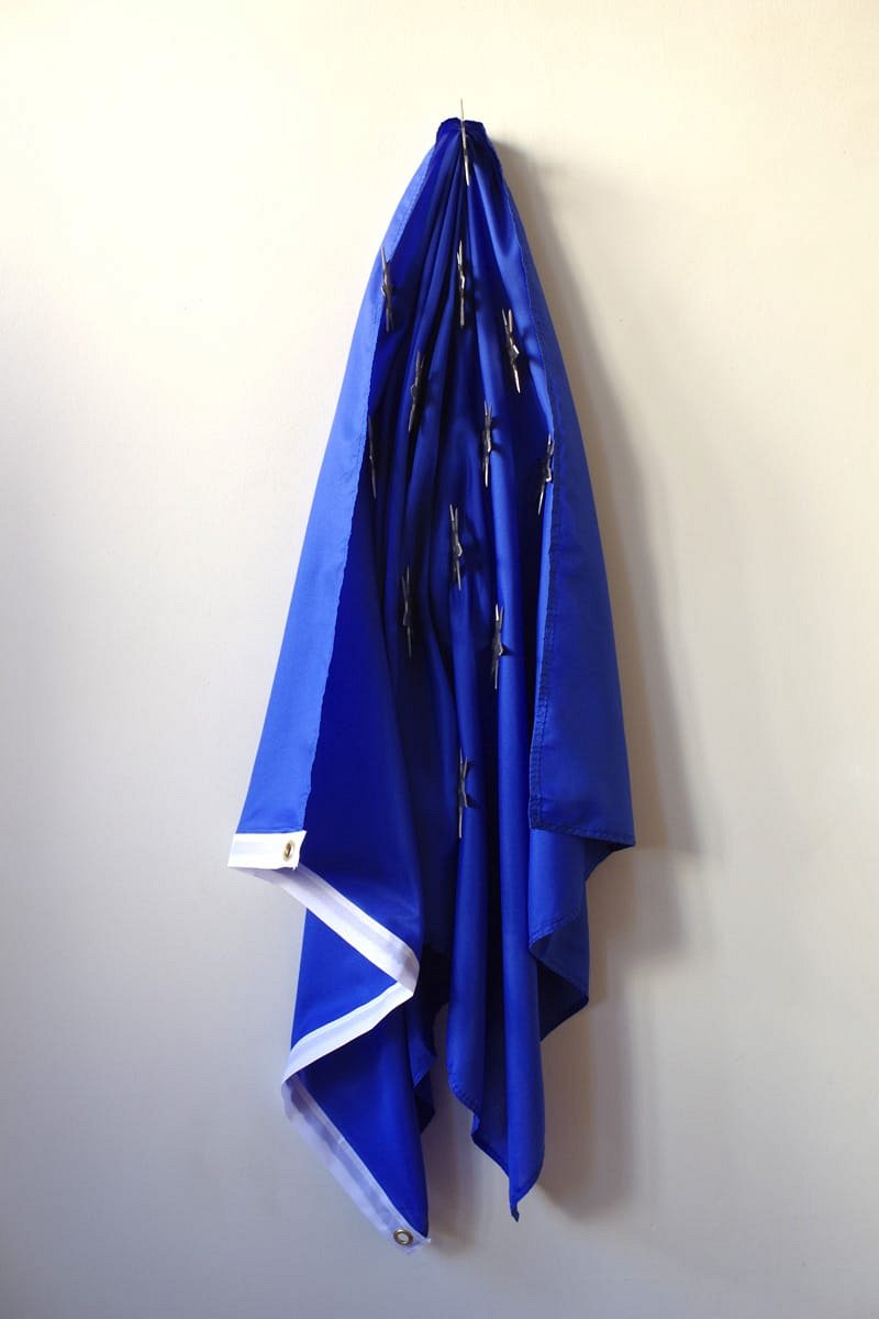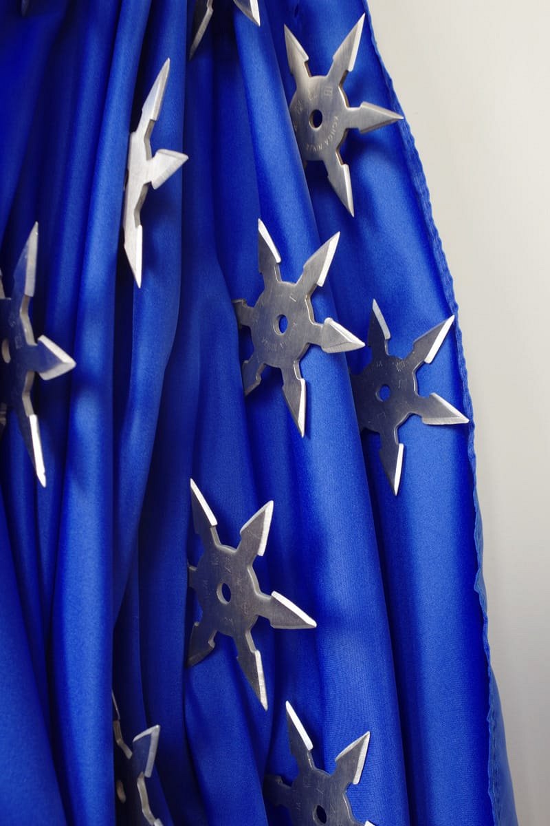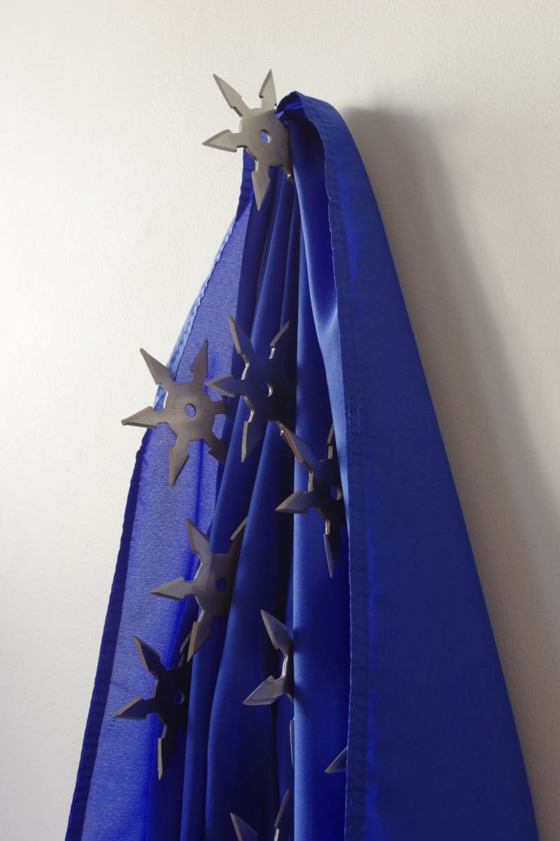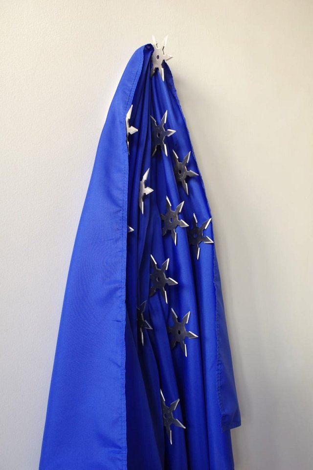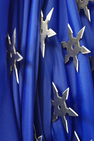 12 ninja stars (“shuriken”) stuck in a blue flag.