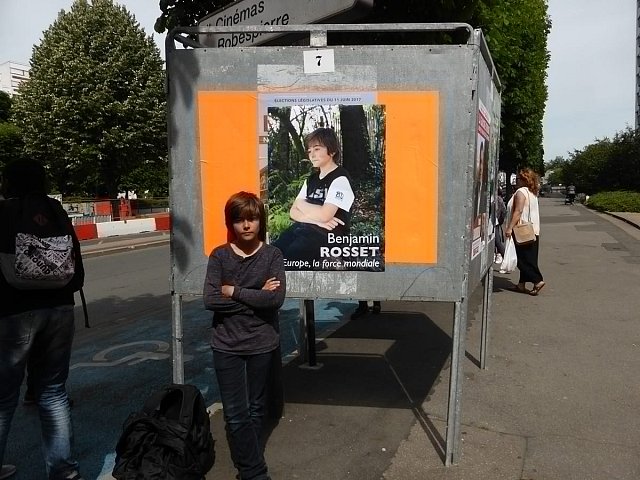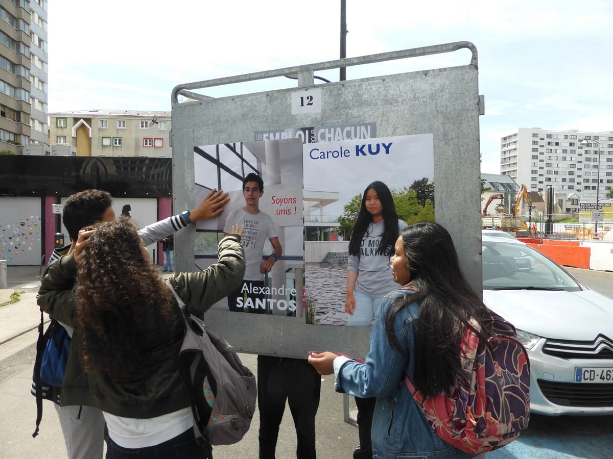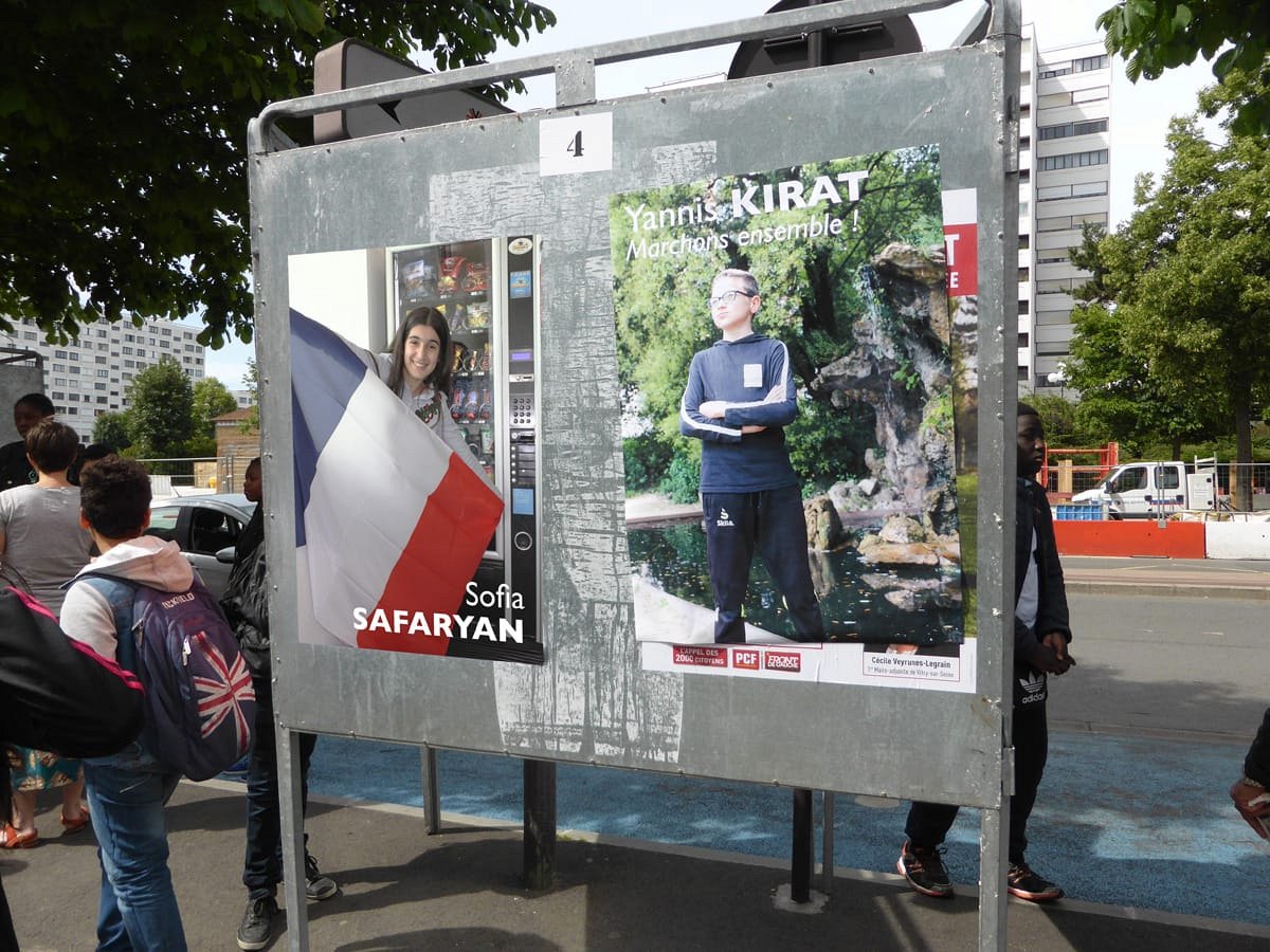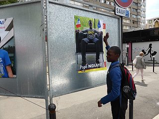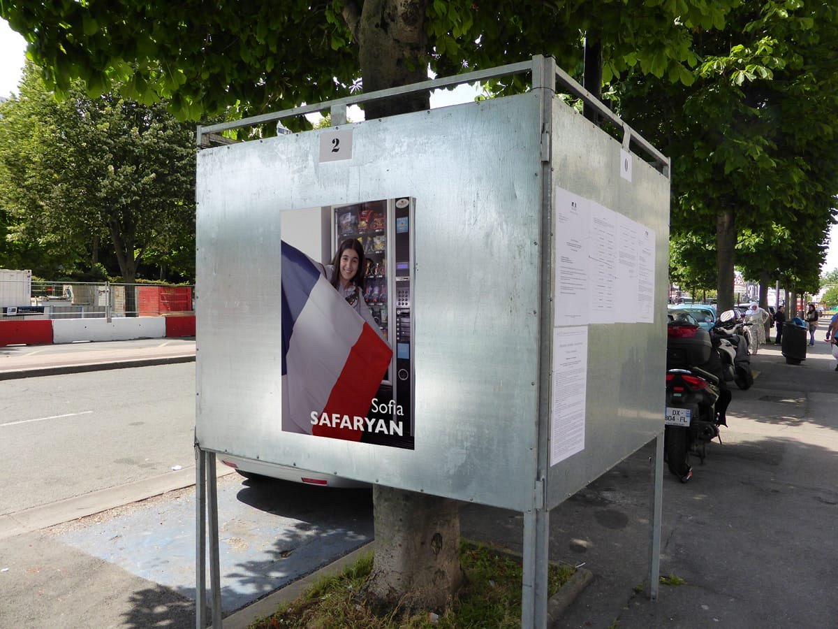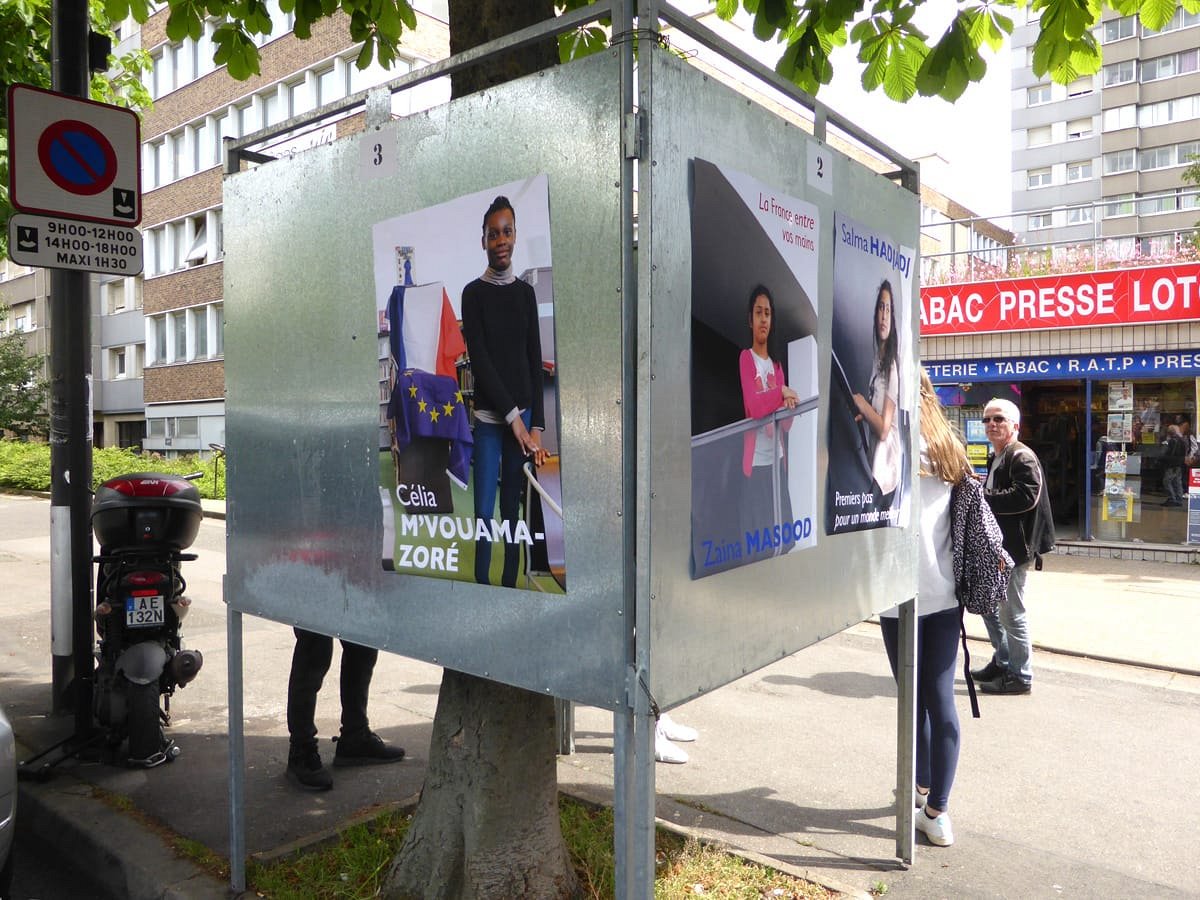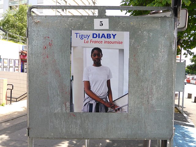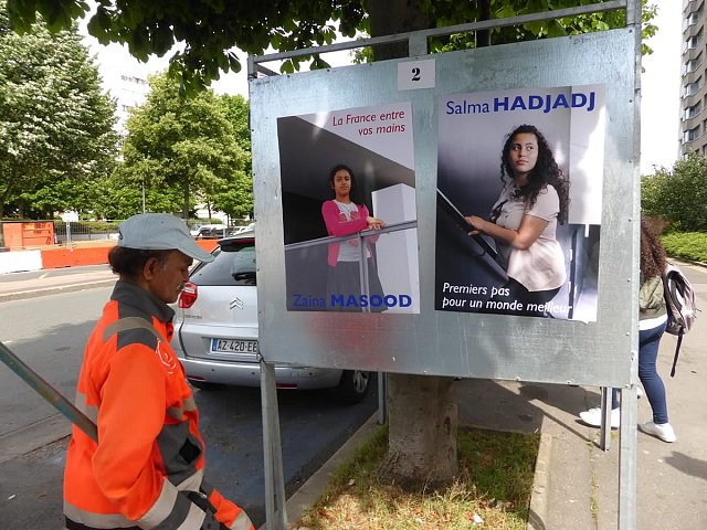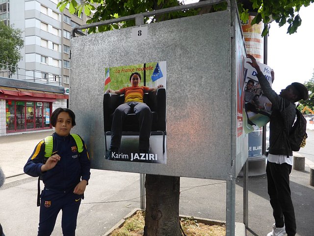 Election leaflets and posters, displayed “pirating” the official poster panels during the legislative election campaign of 2017, Vitry-sur-Seine.