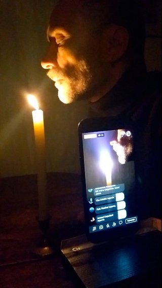 Assis à une table, à très grande proximité d’une bougie, à quelques centimètres.