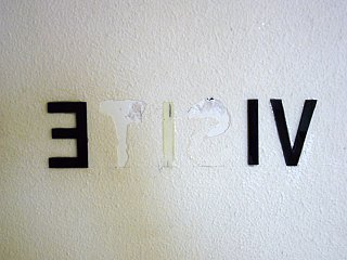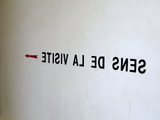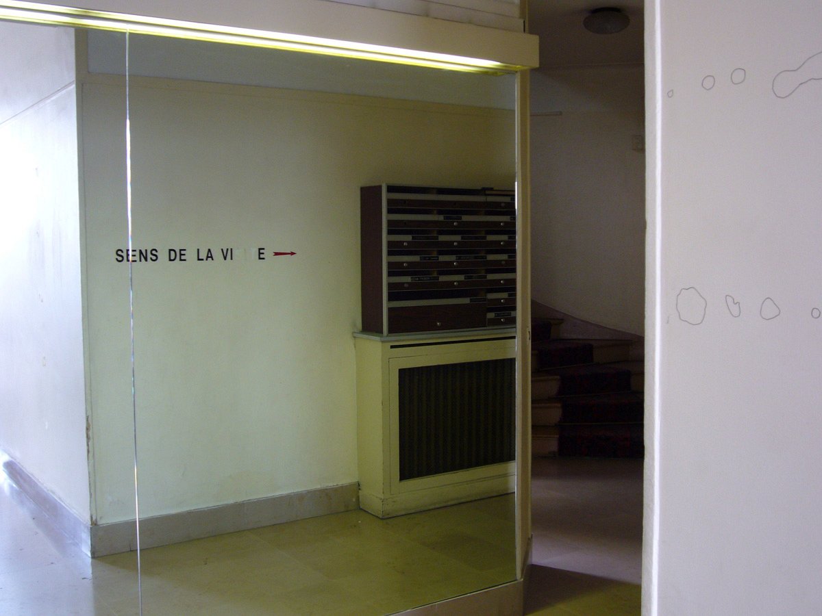 This time the inscription “Sens de la visite”, was transformed by a “voluntary act of vandalism” (as Yvon put it) into “Sense of life”, and was written in reversed letters which became readable in a big mirror at the entrance hall of the building (panorama photo : Nicolas Durand).
