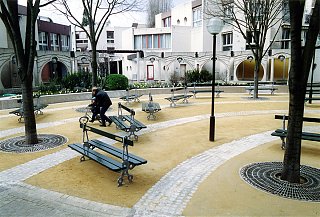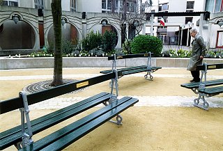 • Twelve public benches, installed in a curve, like a wave, a flock of birds, an assembly. An asymmetric curved dispositive, with as a final point an intimate corner with two benches around a table.
