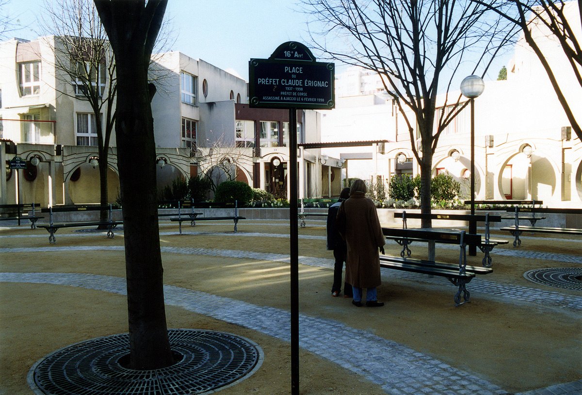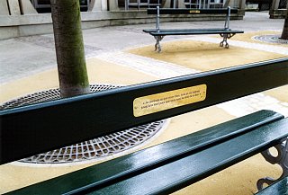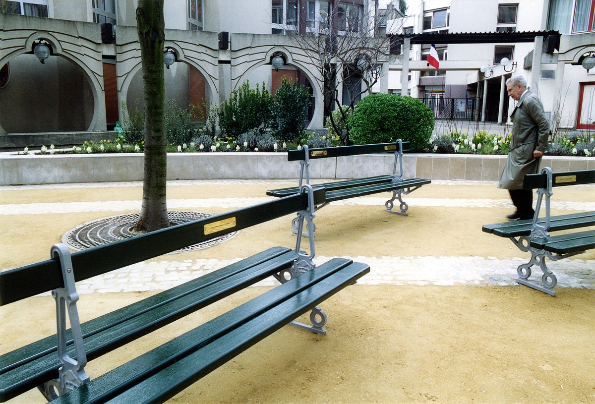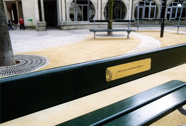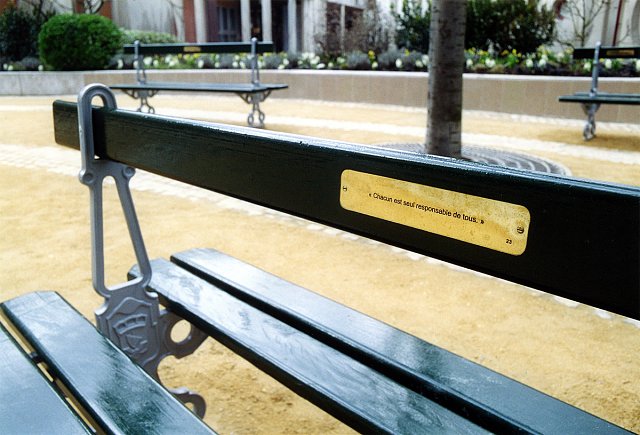The benches are the typical Parisian two-faced benches with a wooden seat and an iron structure. Each bench has three brass plates fixed on its back, with phrases from Claude Erignac’s personal notebook. They are short, virtuous sentences about subjets such as the freedom of expression, tolerance, the importance of education and of the transmission of knowledge, responsibility, civic sense, prospecting into the future, but also more emotional or funny aphorisms and proverbs. The quotations are from Woody Allen, Guillaume Apollinaire, Gaston Berger, Albert Camus, Nicolas Chamfort, René Char, Georges Clemenceau, Francis Scott Fitzgerald, Jean Giraudoux, Johann Wolfgang Goethe, Guillaume d’Orange, Victor Hugo, Abraham Lincoln, Martin Luther, André Malraux, Herbert Marcuse, Marivaux, Pierre Mendès France, Mathieu Molé, Pascal, Pablo Picasso, Antoine de Saint-Exupéry, Sénèque, Percey Shelley, Paul Valéry, Voltaire, Oscar Wilde, Emile Zola, a quotation of the jewish memorial in Nancy, a Dogon proverb, and a quotation by Claude Erignac himself.