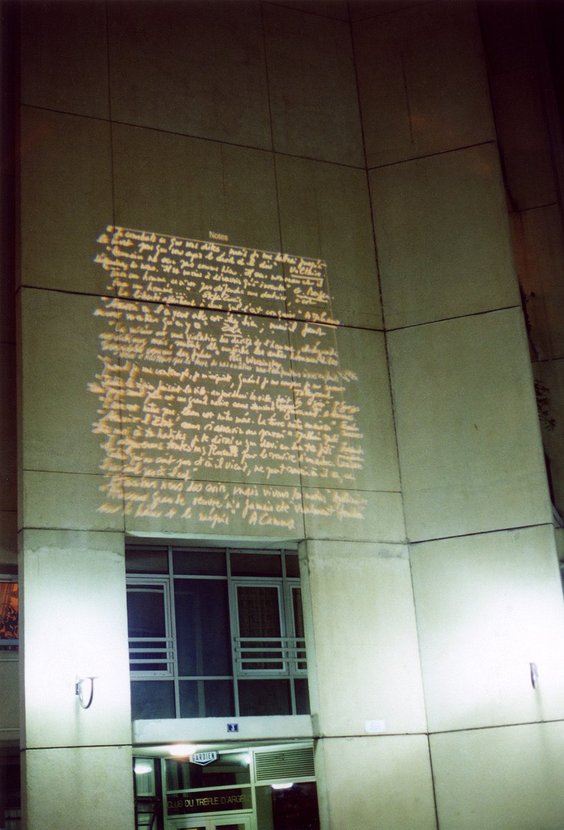 • At nighttime, this device is completed by the projection of one page of Erignac’s quotation notebook, on the facade of the neighbouring building that frames the entrance of the square with two high walls (without an opening). One of these walls becomes a screen, a surface for ideas, a page to write. This projection is a continuation of the sentences on the benches and animates them, transforming them into light, the essence of an idea.