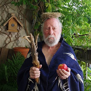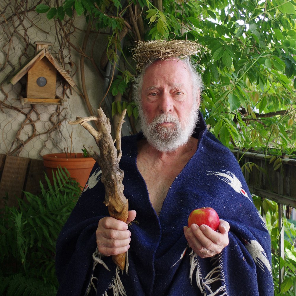 Portrait du père de l’artiste Peter Gautel en « Roi Lear », Karlsruhe, juin 2021. Sur sa tête en guise de couronne un nid d’oiseau, tombé de l’arbre sous lequel repose Uta Gautel.