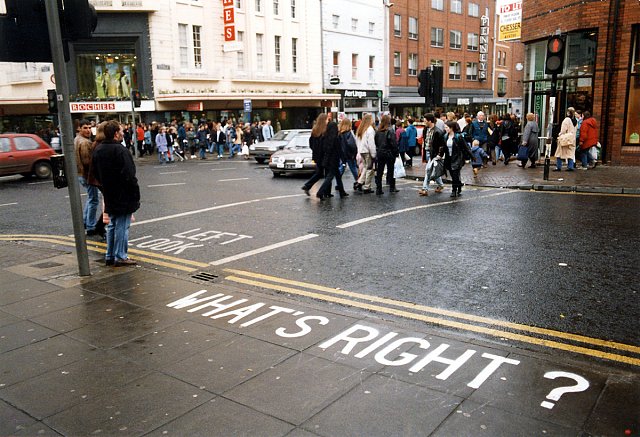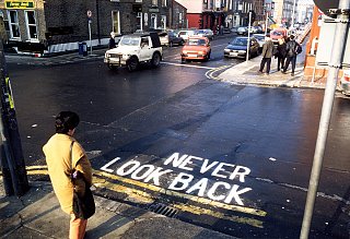 When we had just finished writing NEVER LOOK BACK, an old lady passed by, saying : “I wish I hadn’t…” And underneath WHAT’S RIGHT? someone added, in chalk : “I don’t know.”