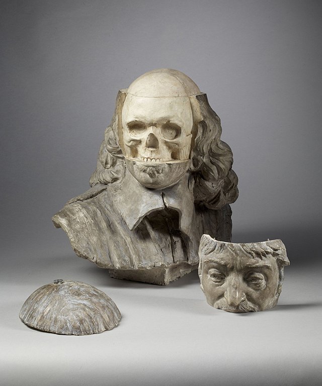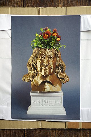 Assemblage (digital 3D print of a bust of the French philosopher René Descartes, 1596-1650, pansies, “pensées” = “thoughts” in French).