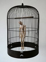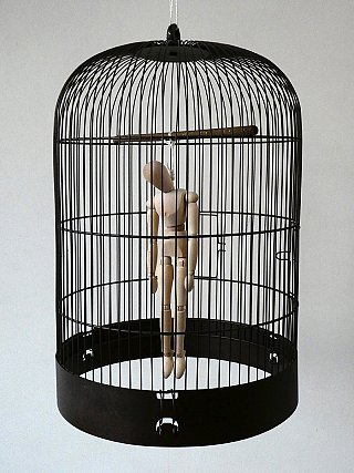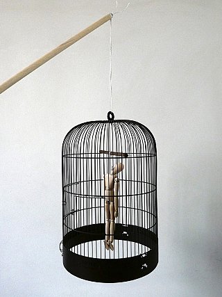 J’ai réalisé à cette occasion cet autoportrait d’un mannequin articulé en bois – typique du travail des artistes et architectes – pendu dans sa cage…