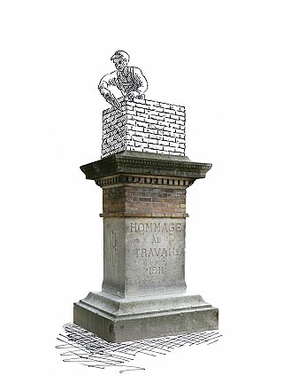 A mason on the plinth (which has already been raised in the past by rows of bricks) builds brick walls around her or him, row by row, higher and higher, to the maximum possible limit, until she/he is walled in.