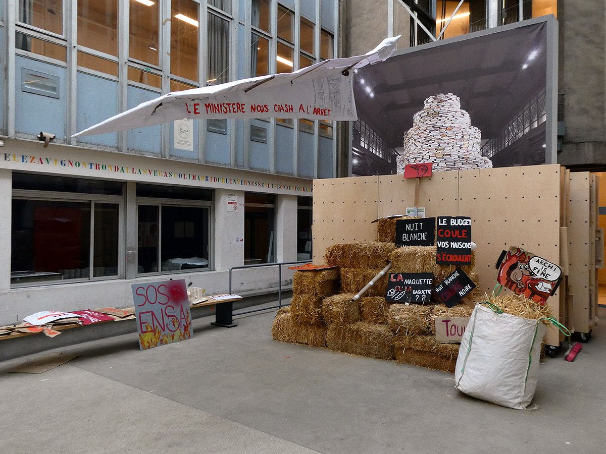 Mobilisation contre le manque de moyens dans les écoles d’architecture et d’art, ENSAPLV, Paris, printemps 2023 — la Tour de Babel en toile de fond. -