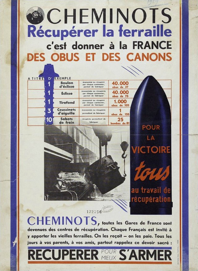 Railway workers, recovering scrap metal means giving France shells and cannons, poster, 1940s, Ville de Paris - Bibliothèque Forney -
